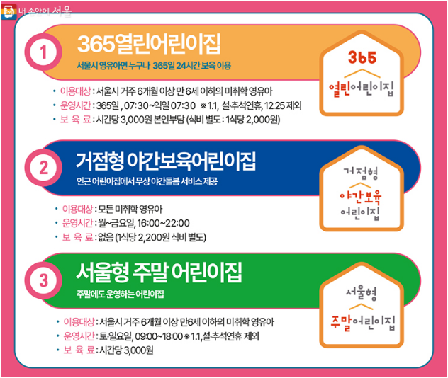 서울시에서는 다양한 보육서비스를 운영중입니다. 대표적으로 평일 저녁에 운영하는 거점형 야간보육어린이집, 주말에 운영하는 서울형 주말 어린이집, 365일 24시간 운영하는 열린어린이집 3가지 제도가 있습니다. 아래에서 각각을 자세히 살펴보겠습니다.