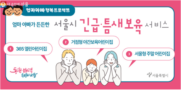평일에 갑자기 야근을 하게 되거나, 주말 휴일에 일이 생겨 아이를 볼보기 힘들어지는 경우 참 난감합니다. 부모님이 맡아주실 수 있는 상황이라면 다행이지만 불가능하다면 도우미를 구해야하는데요 비용이 만만치 않죠. 오늘은 이런분들을 위해 서울시에서 제공하는 긴급 틈새 보육서비스 365열린어린이집, 거점형야간보육어린이집, 휴일보육어린이집 3가지 아이돌봄 서비스 정책을 설명하겠습니다.