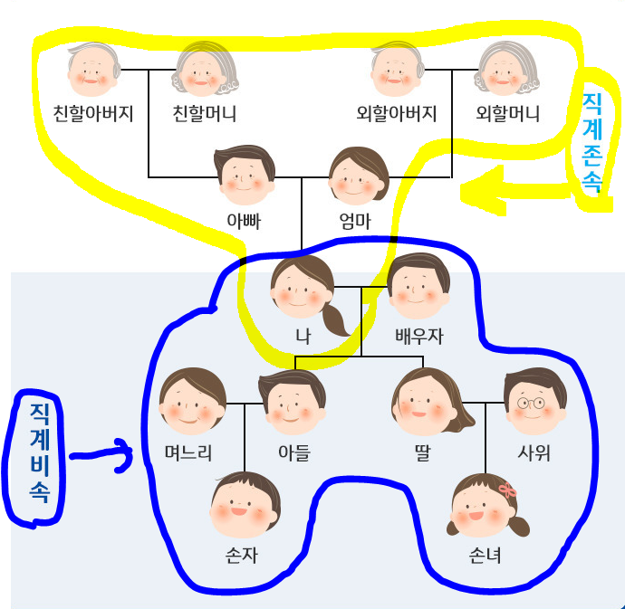 아래의 그림을 보면 직계존속과 직계비속에 대해 이해하기 쉽습니다.